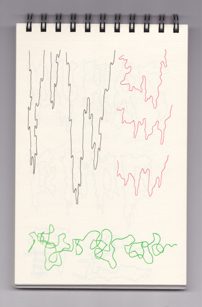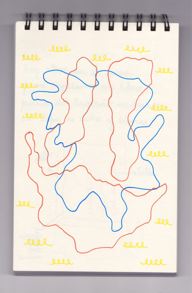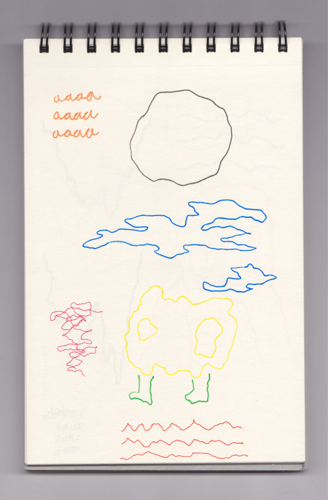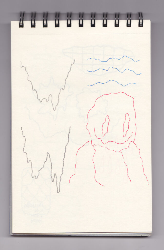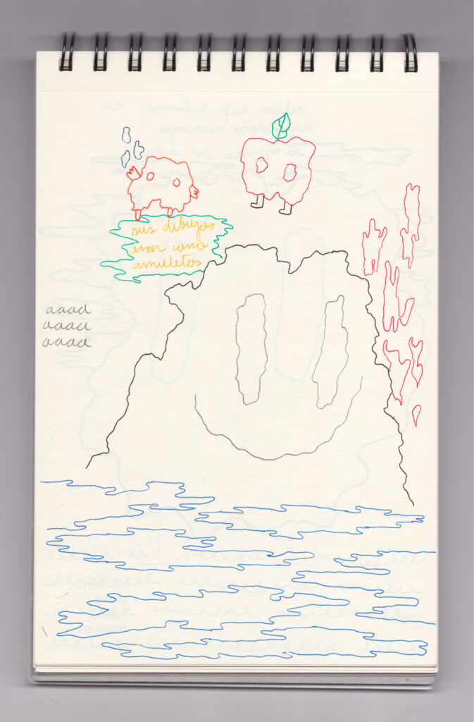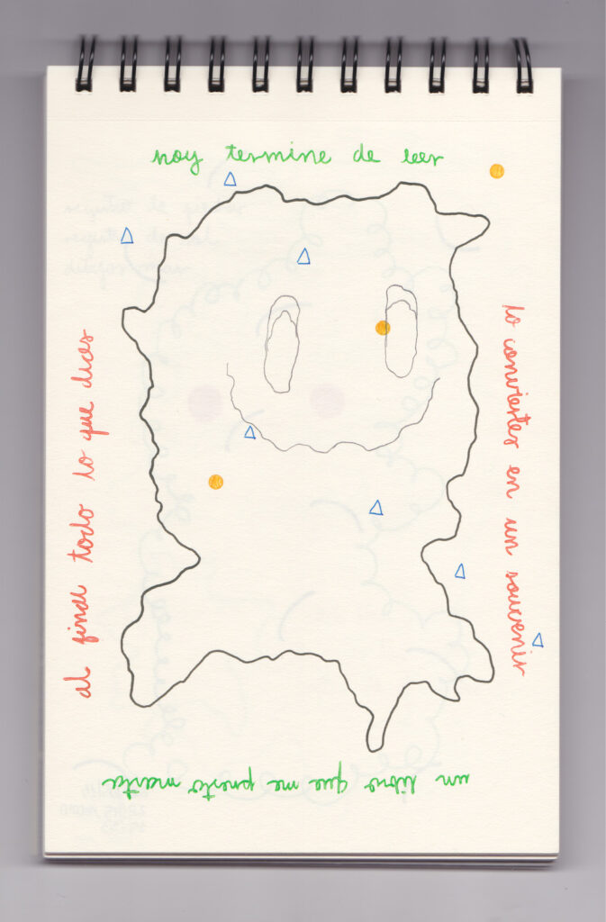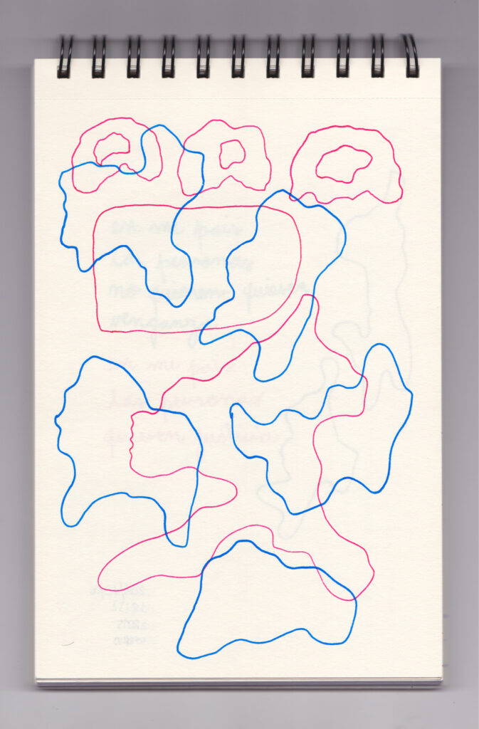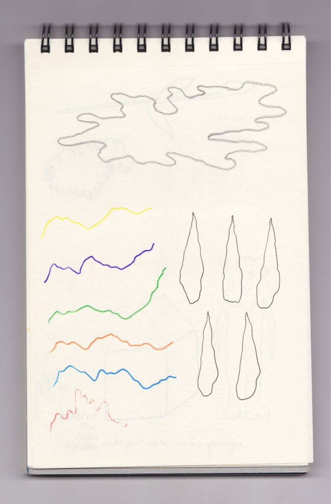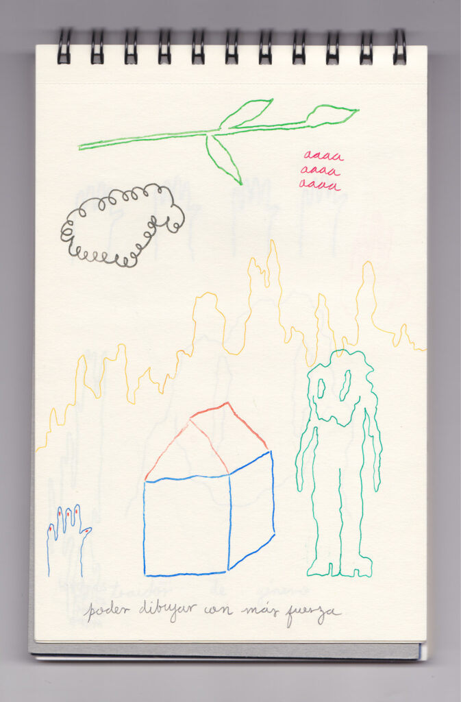 Igual que Libreta de dibujos 01, esta libreta reúne 60 dibujos realizados entre el 17 de julio de 2024 y el 9 de septiembre de 2025. No responden a una idea fija, sino que surgen del deseo de experimentar con distintas técnicas sobre papel. Son registros espontáneos que aparecen cuando no pienso.