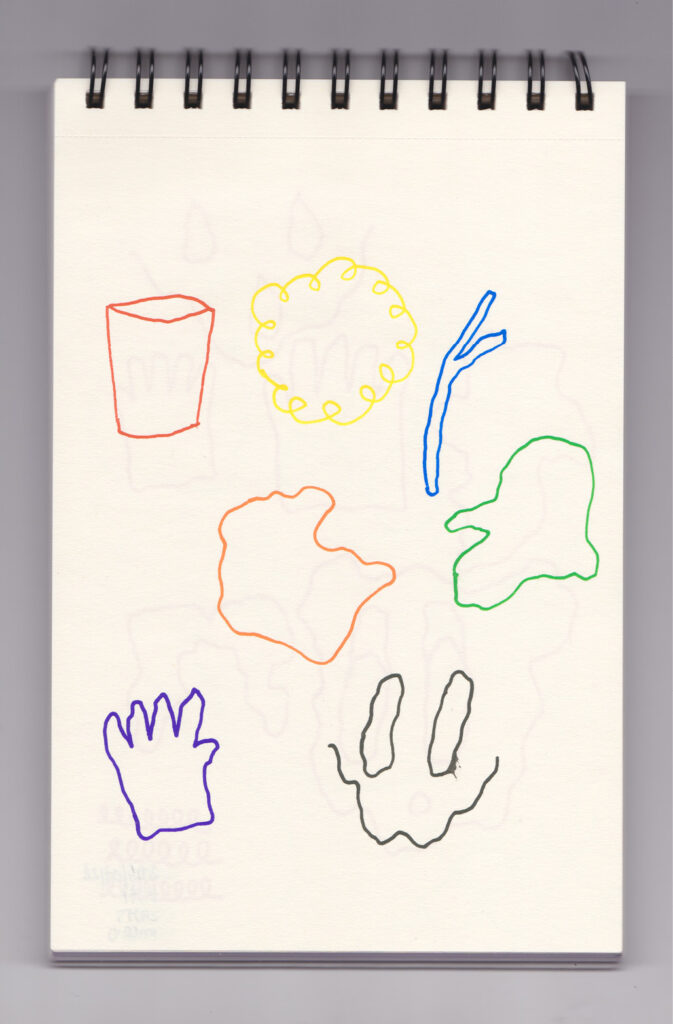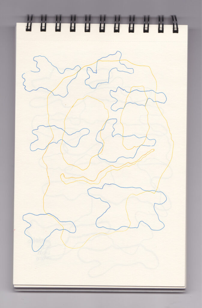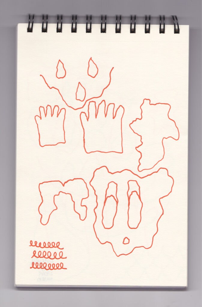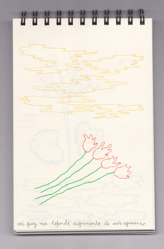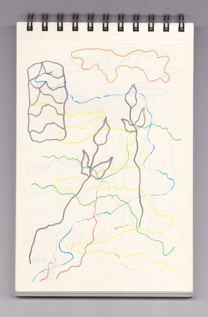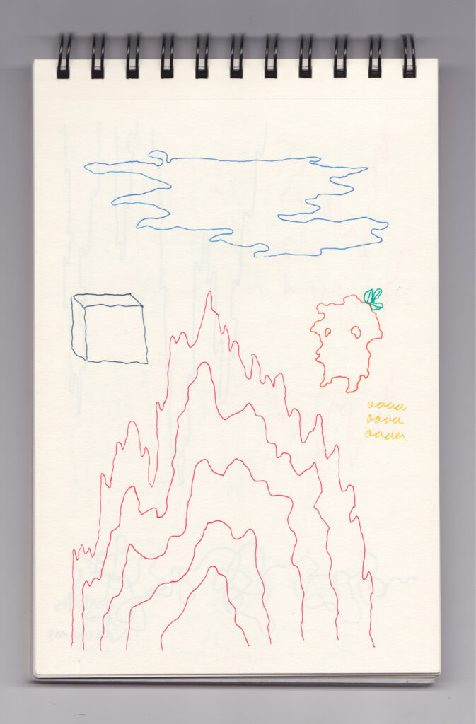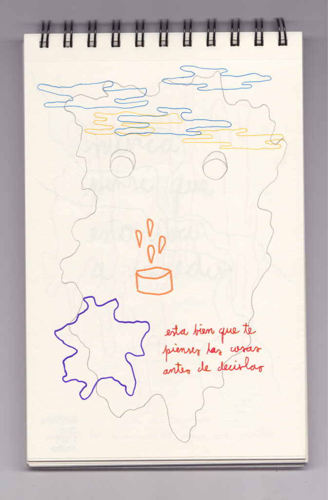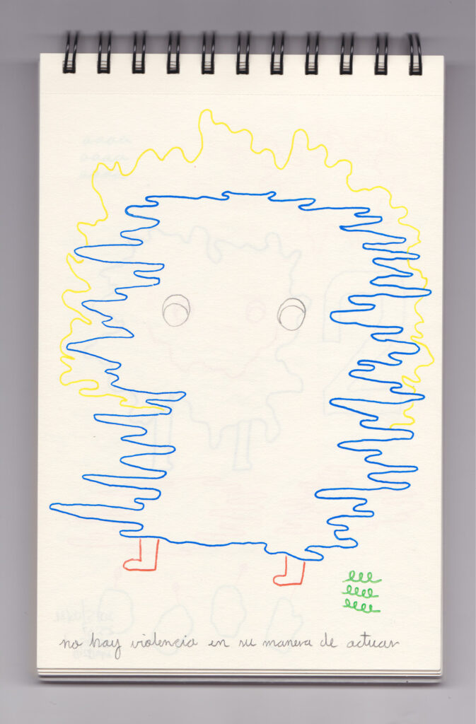 Igual que Libreta de dibujos 01, esta libreta reúne 60 dibujos realizados entre el 17 de julio de 2024 y el 9 de septiembre de 2025. No responden a una idea fija, sino que surgen del deseo de experimentar con distintas técnicas sobre papel. Son registros espontáneos que aparecen cuando no pienso.