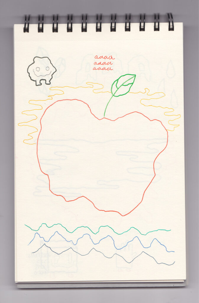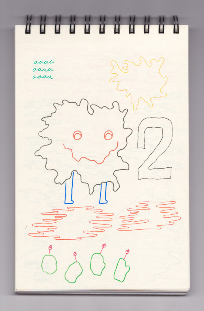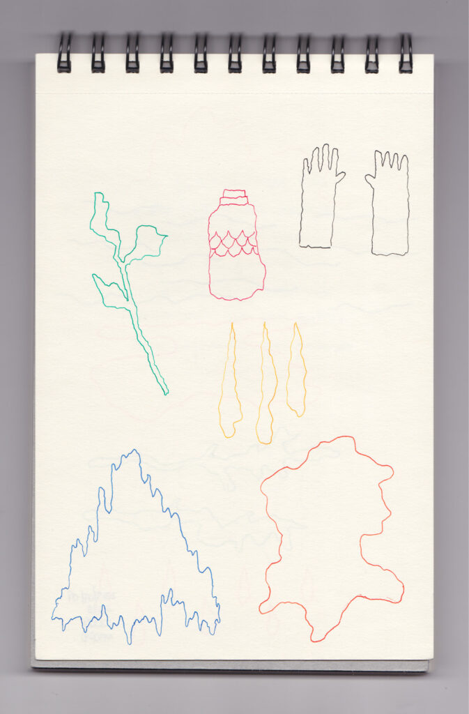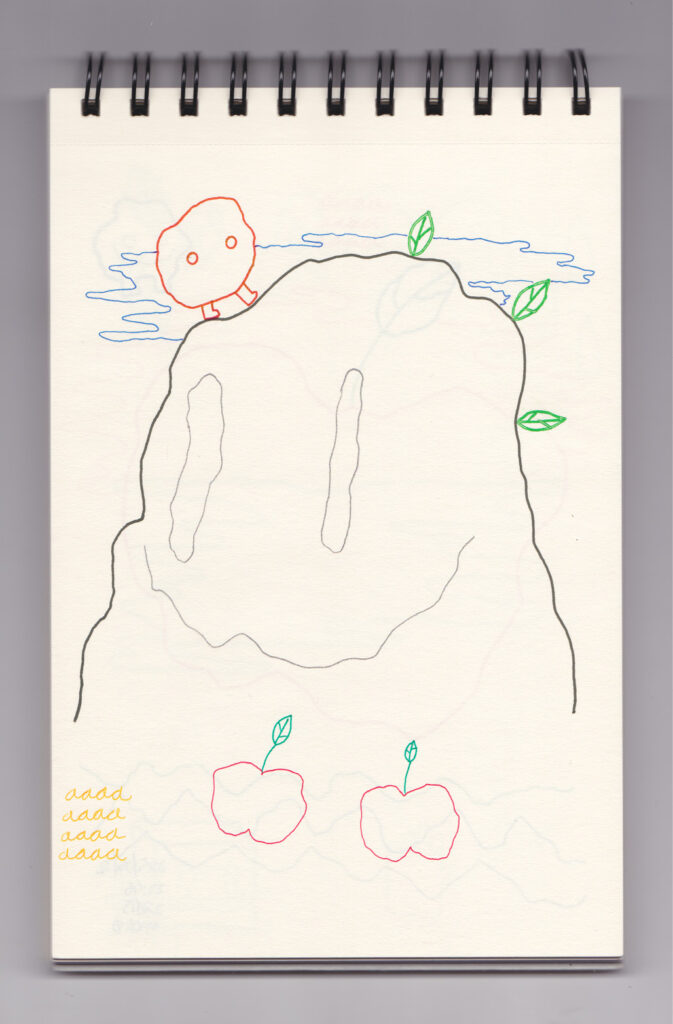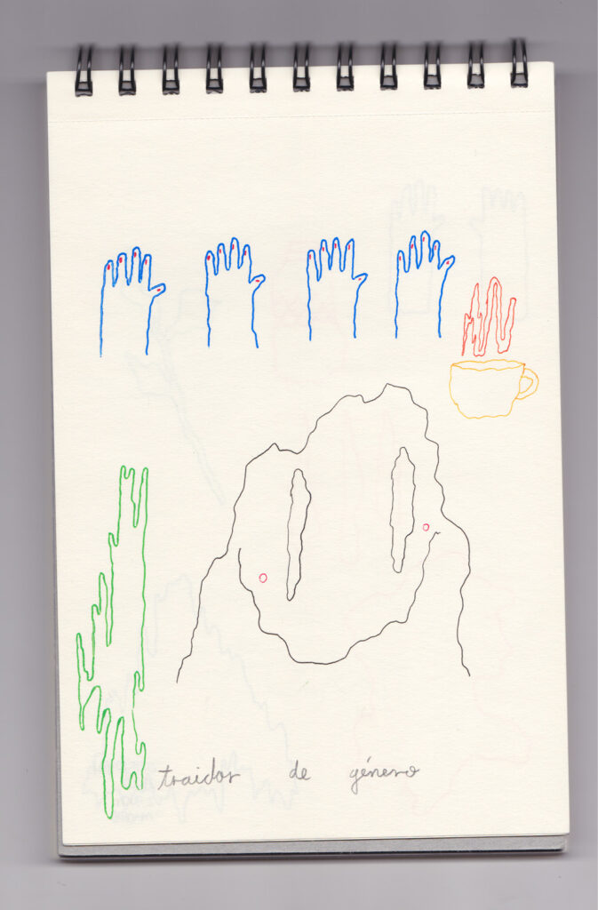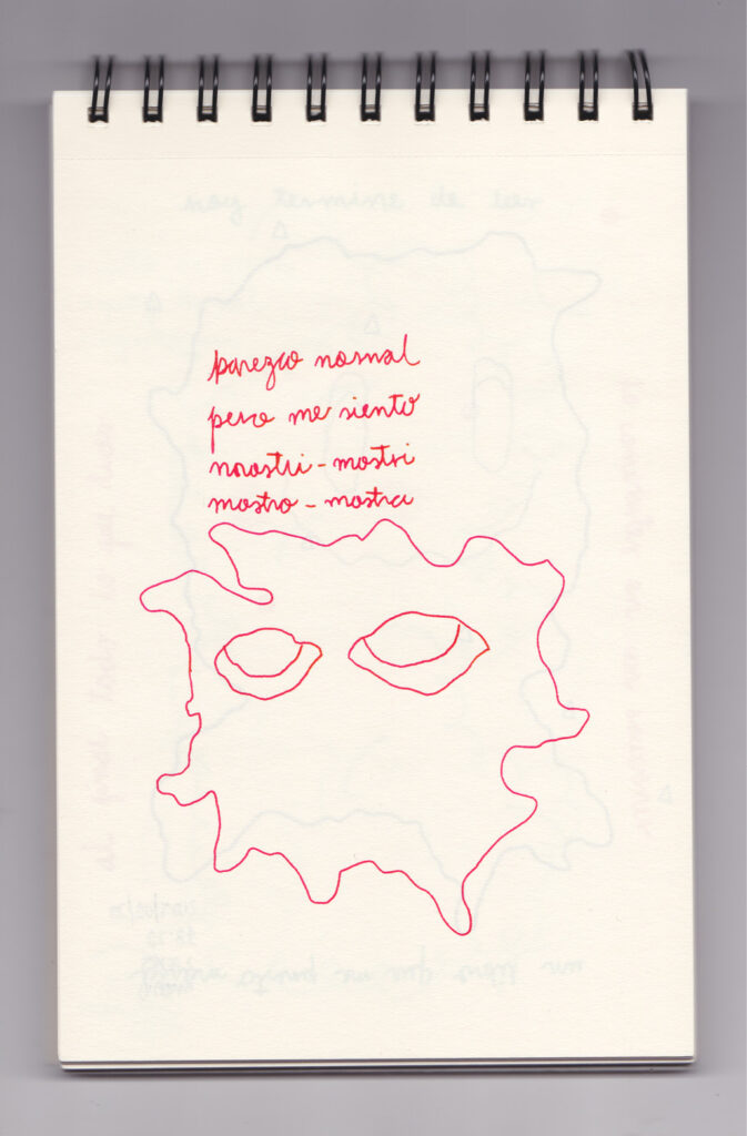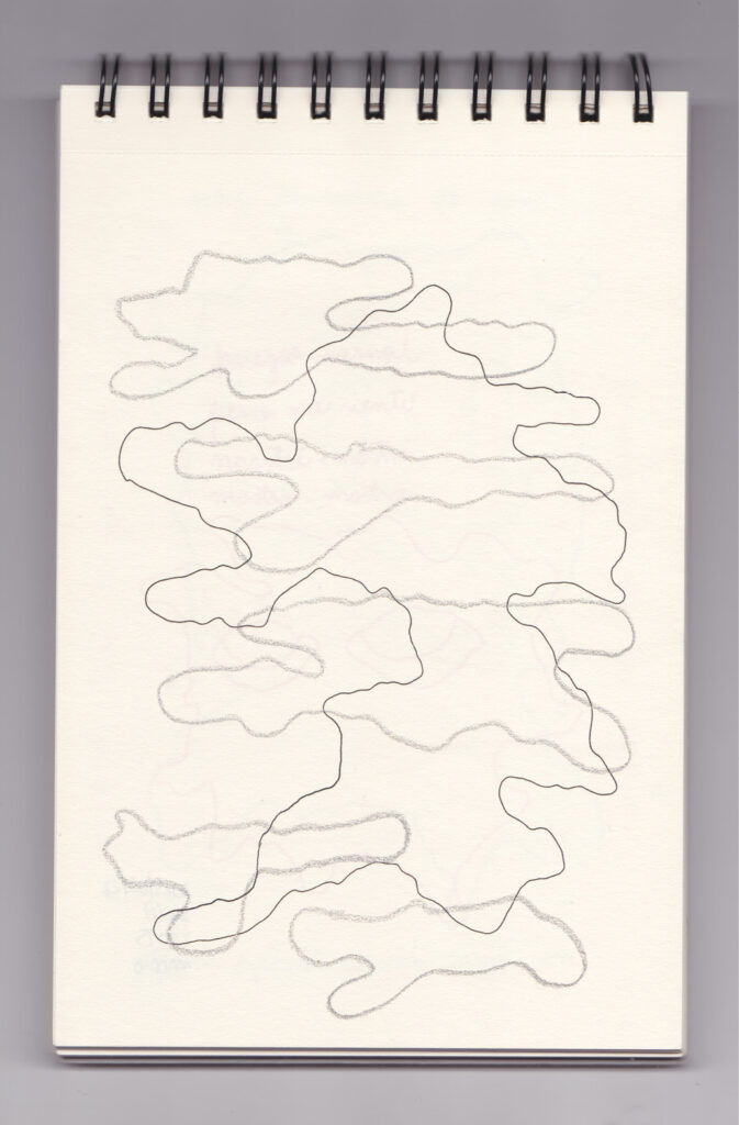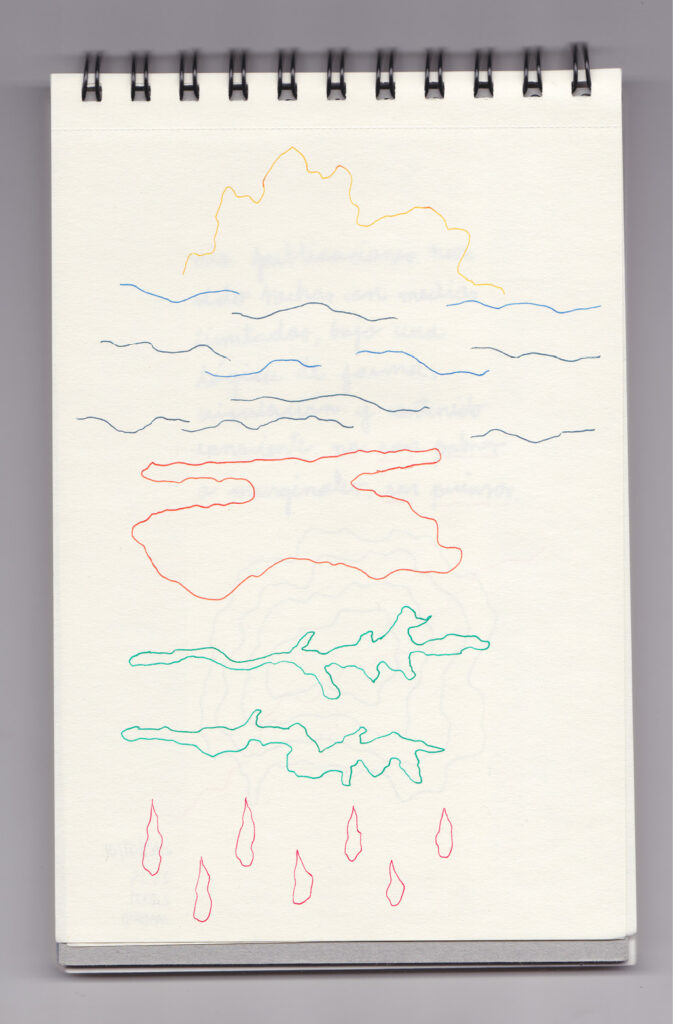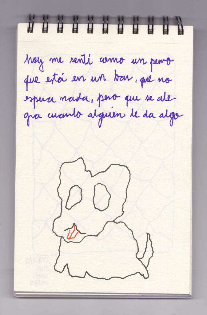 Igual que Libreta de dibujos 01, esta libreta reúne 60 dibujos realizados entre el 17 de julio de 2024 y el 9 de septiembre de 2025. No responden a una idea fija, sino que surgen del deseo de experimentar con distintas técnicas sobre papel. Son registros espontáneos que aparecen cuando no pienso.