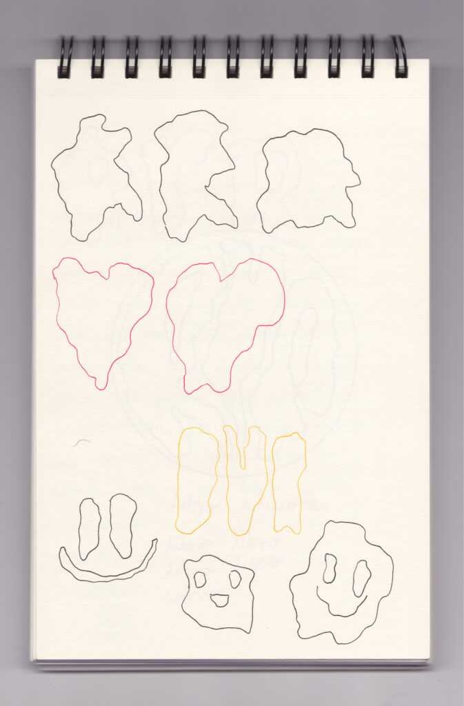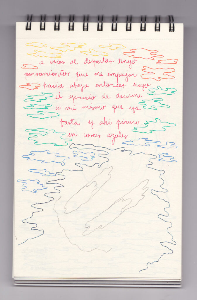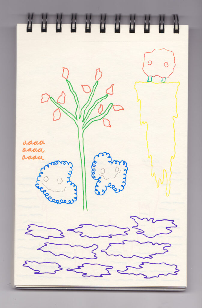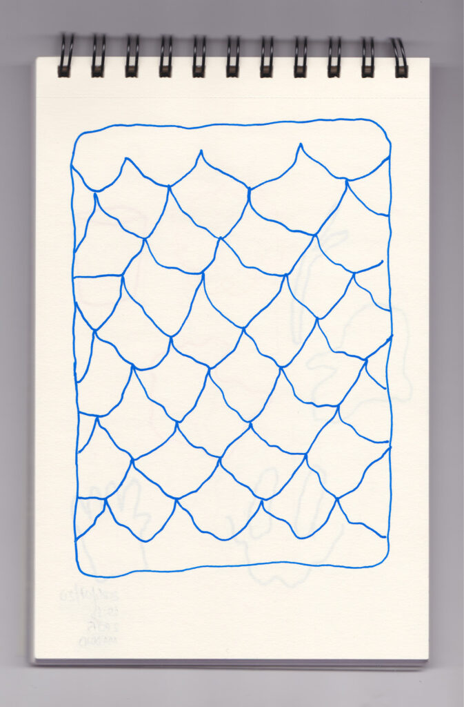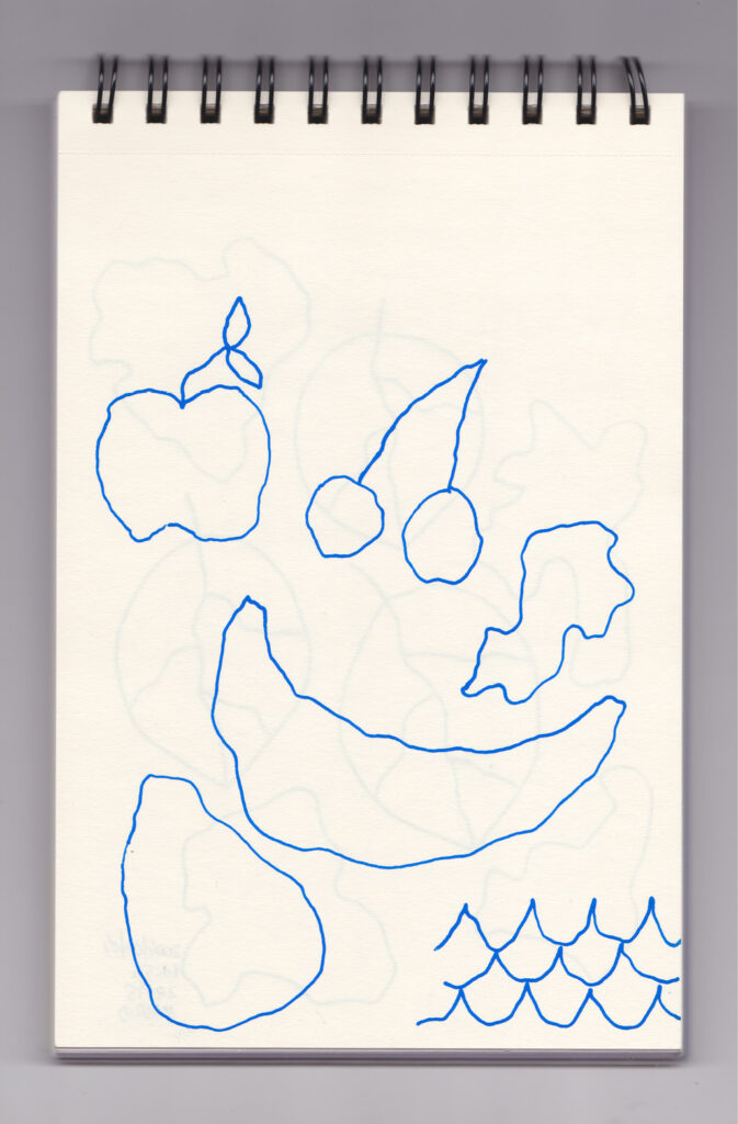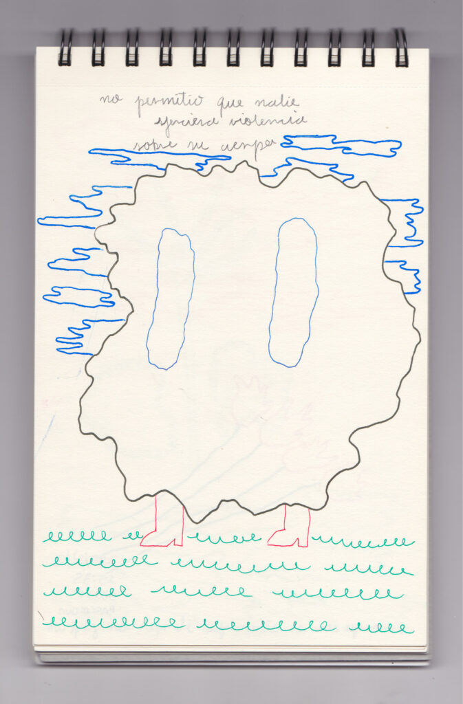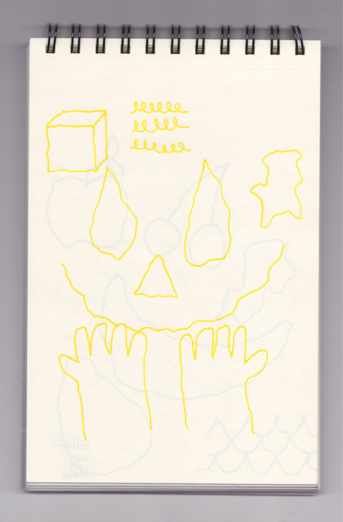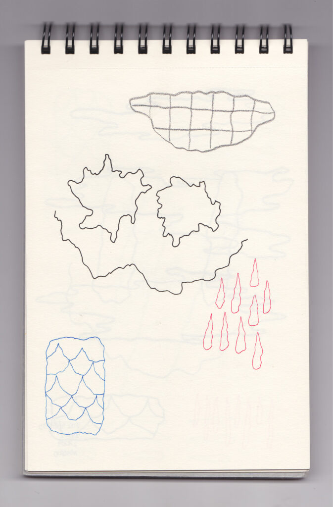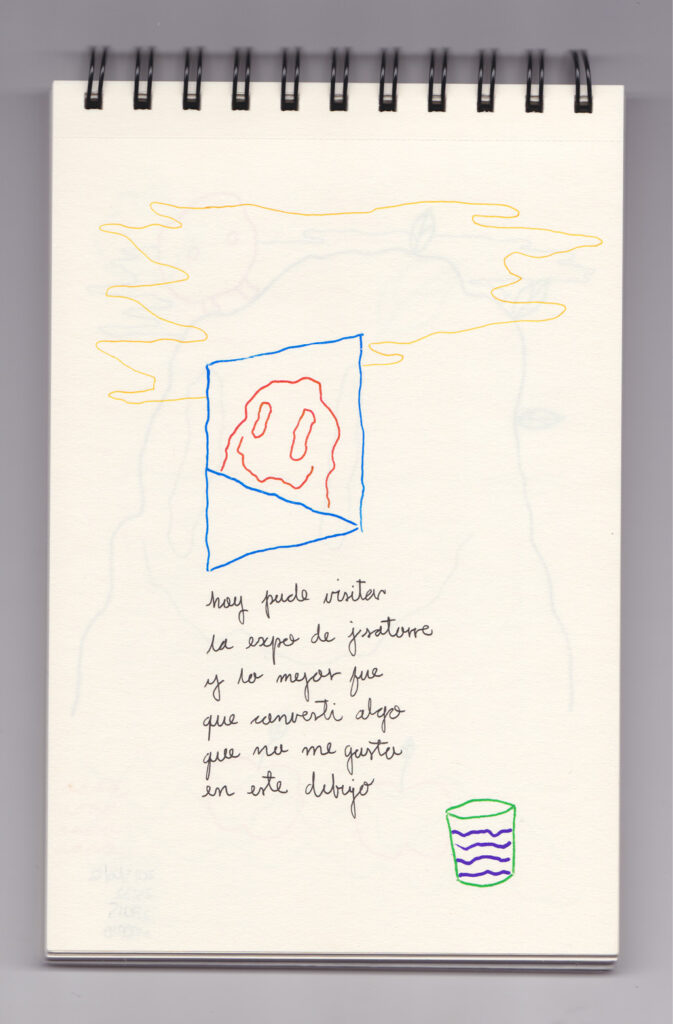 Igual que Libreta de dibujos 01, esta libreta reúne 60 dibujos realizados entre el 17 de julio de 2024 y el 9 de septiembre de 2025. No responden a una idea fija, sino que surgen del deseo de experimentar con distintas técnicas sobre papel. Son registros espontáneos que aparecen cuando no pienso.