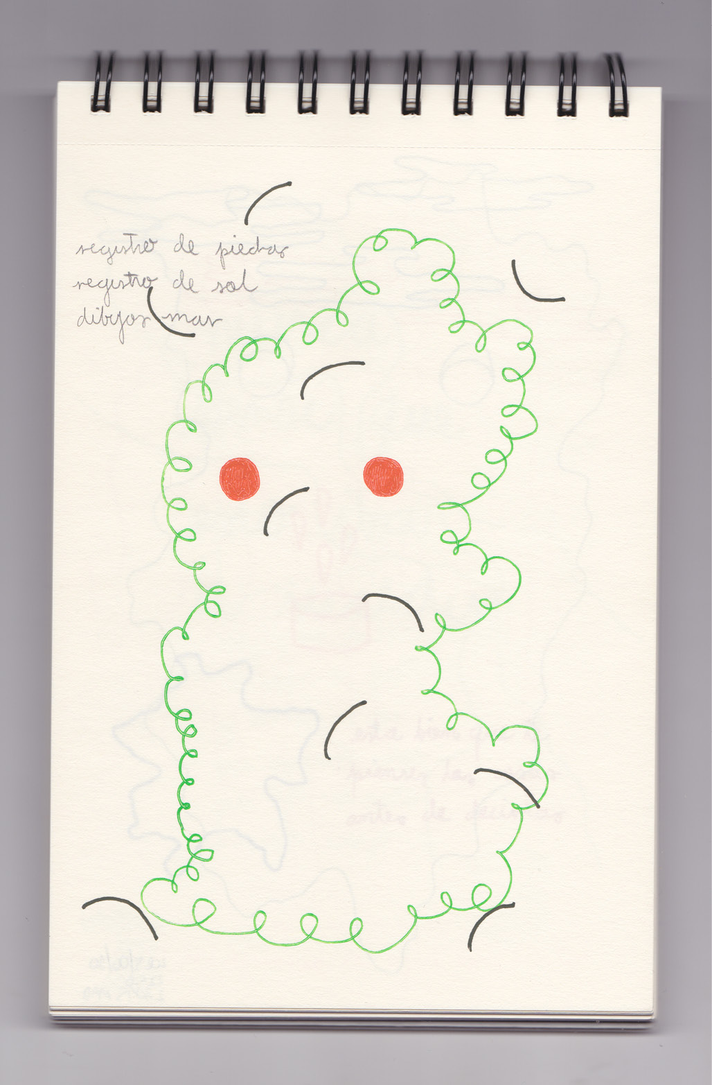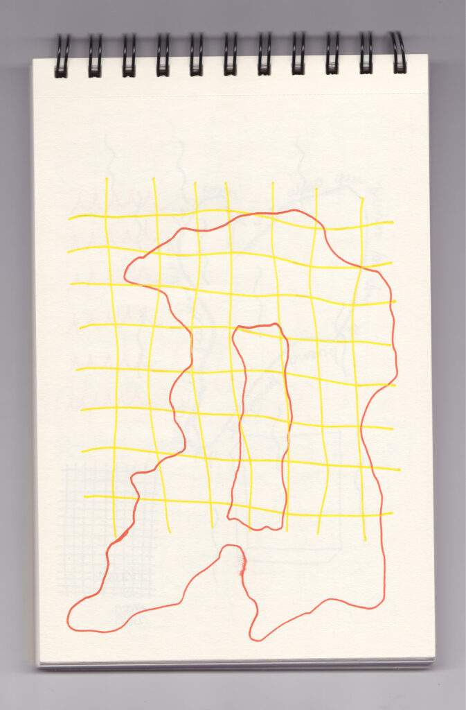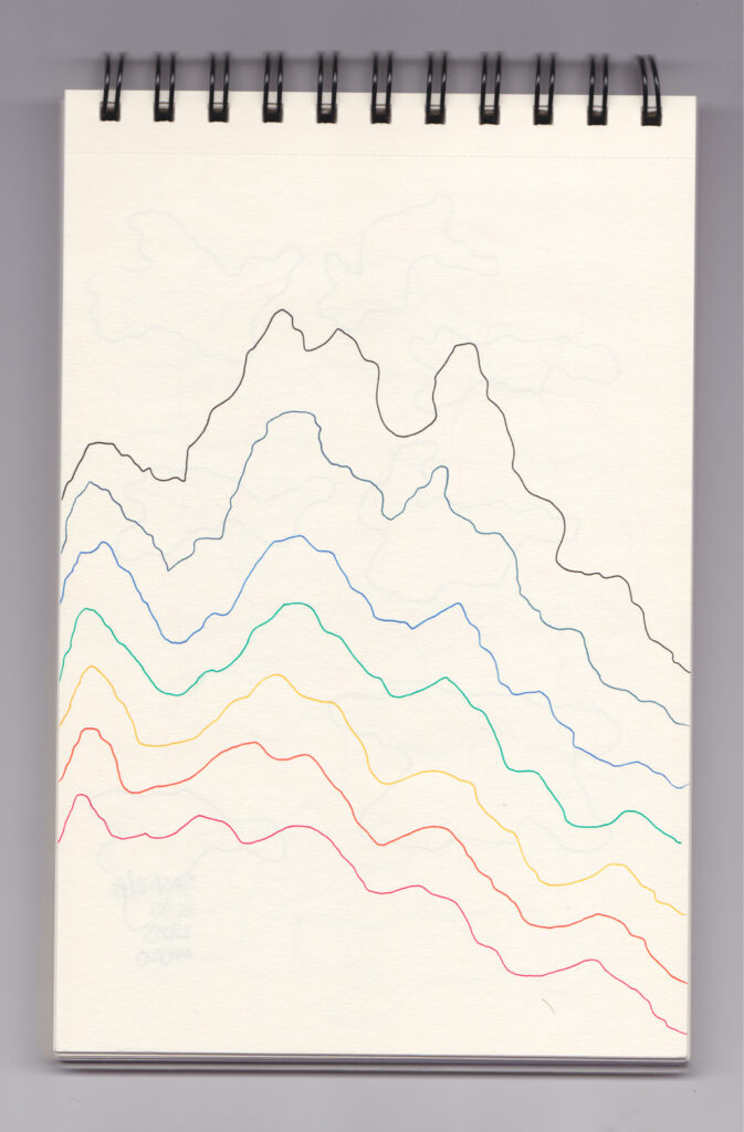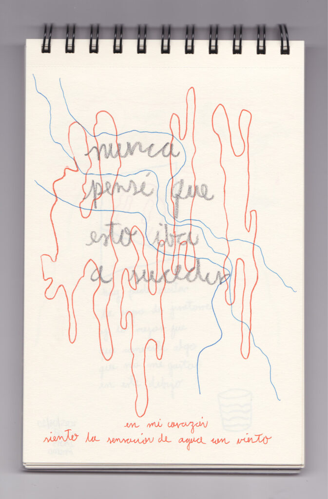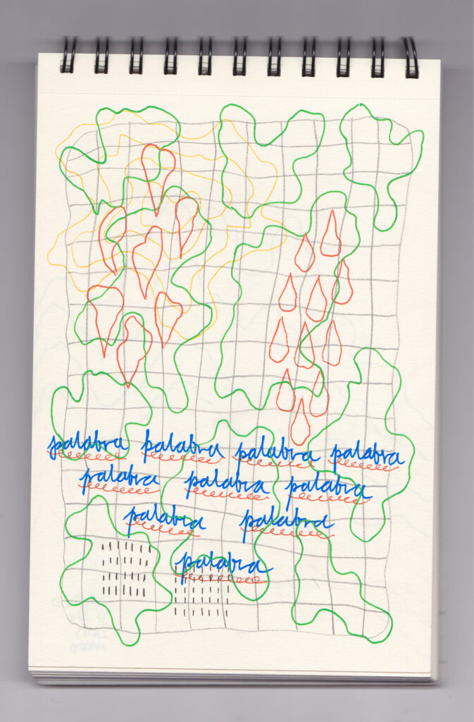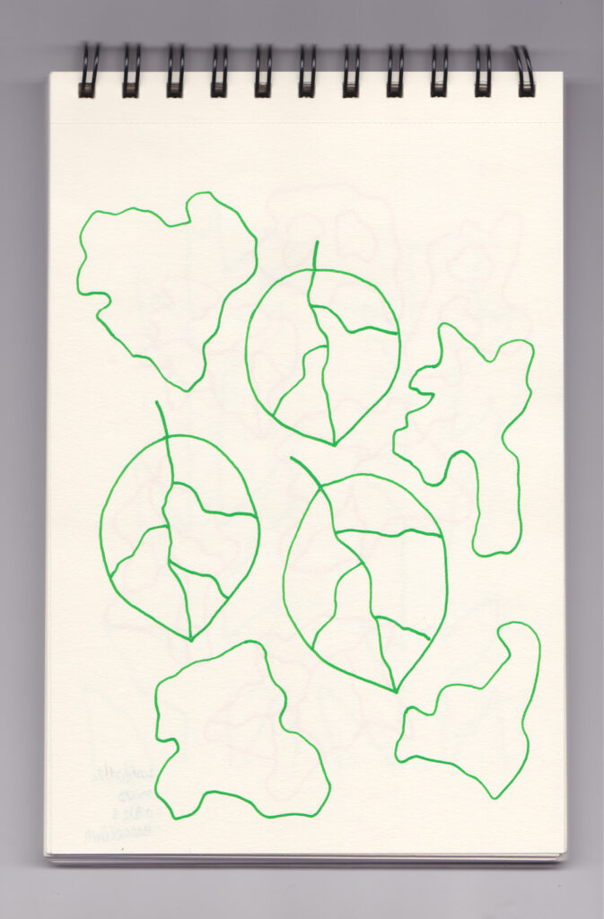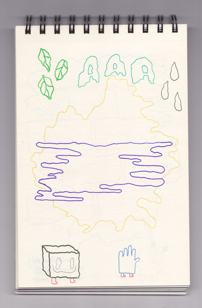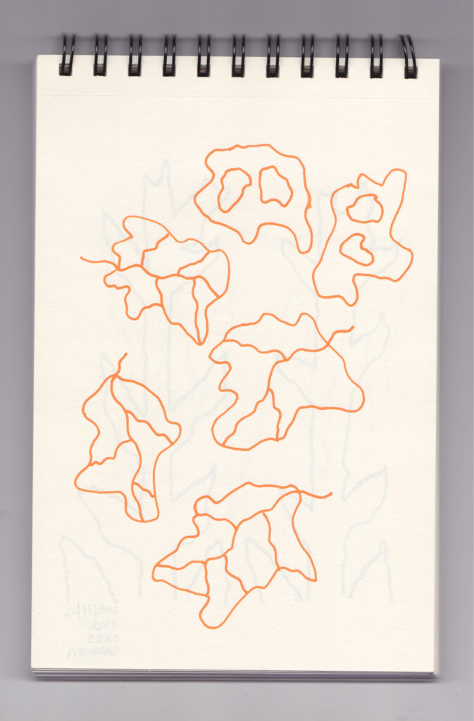 Igual que Libreta de dibujos 01, esta libreta reúne 60 dibujos realizados entre el 17 de julio de 2024 y el 9 de septiembre de 2025. No responden a una idea fija, sino que surgen del deseo de experimentar con distintas técnicas sobre papel. Son registros espontáneos que aparecen cuando no pienso.