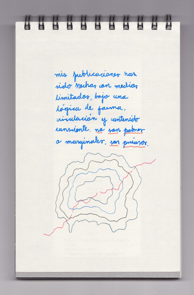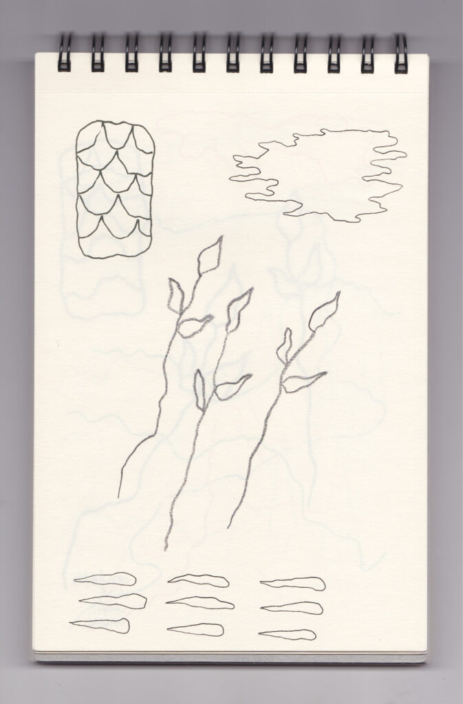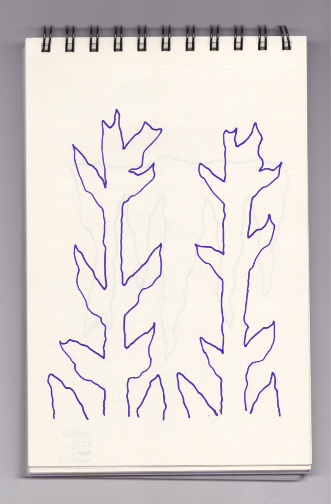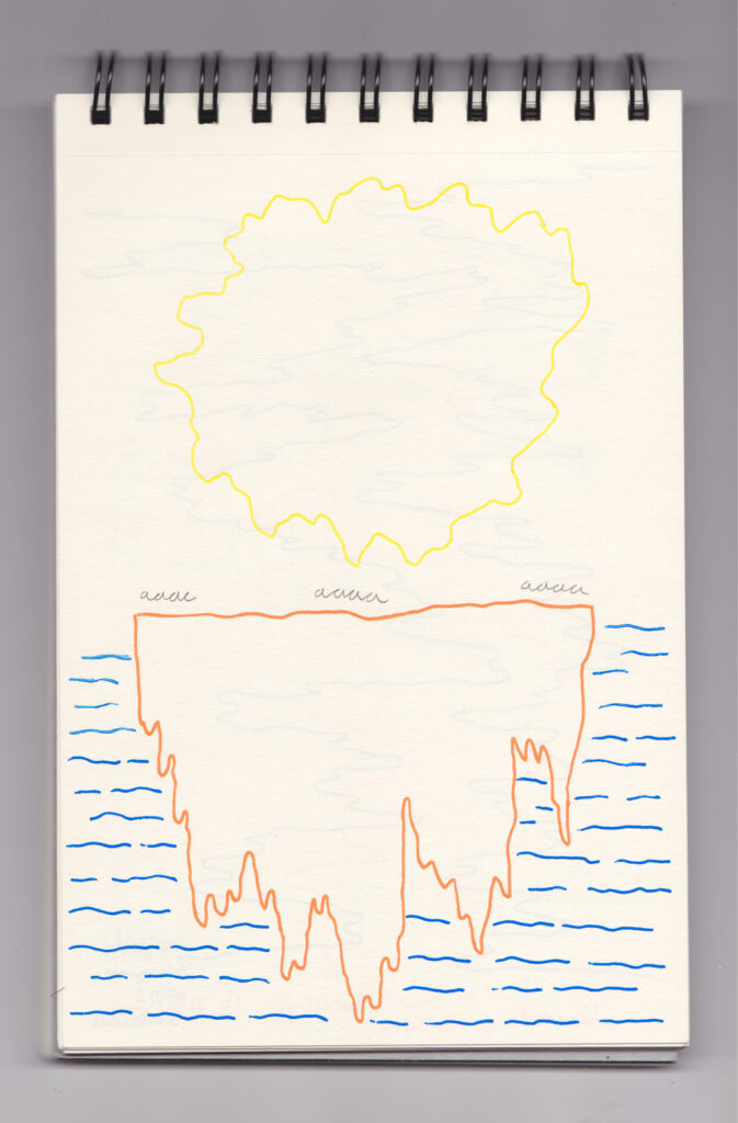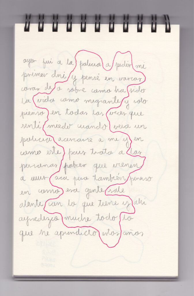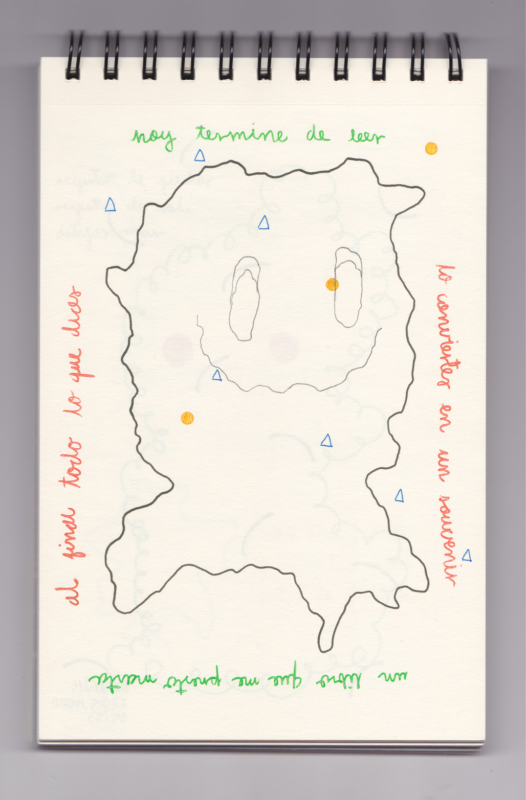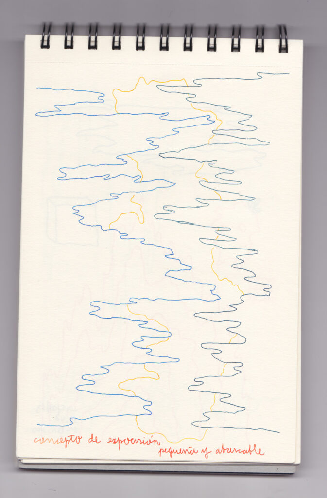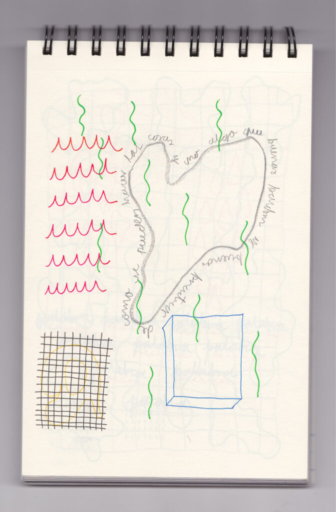 Igual que Libreta de dibujos 01, esta libreta reúne 60 dibujos realizados entre el 17 de julio de 2024 y el 9 de septiembre de 2025. No responden a una idea fija, sino que surgen del deseo de experimentar con distintas técnicas sobre papel. Son registros espontáneos que aparecen cuando no pienso.